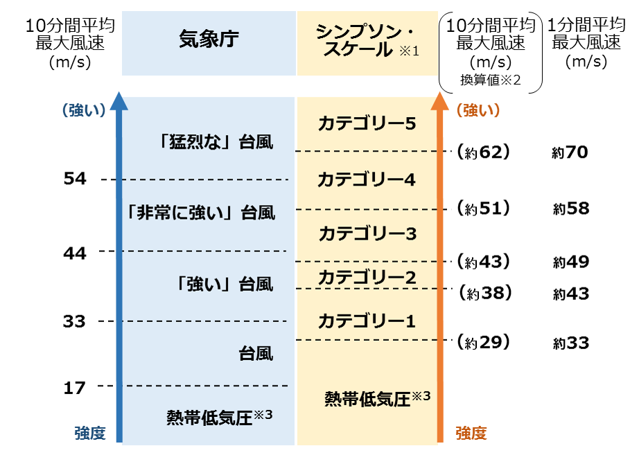 熱帯低気圧は風速によって分類される。世界で用いられているシンプソン・スケールでは、1分間の平均最大風速により、熱帯低気圧をカテゴリー1から5に分類している(最も強いカテゴリーが5)。一方、気象庁では10分間平均風速を指標として台風の階級を定義している。両者を比較したものが表7-1.1である。