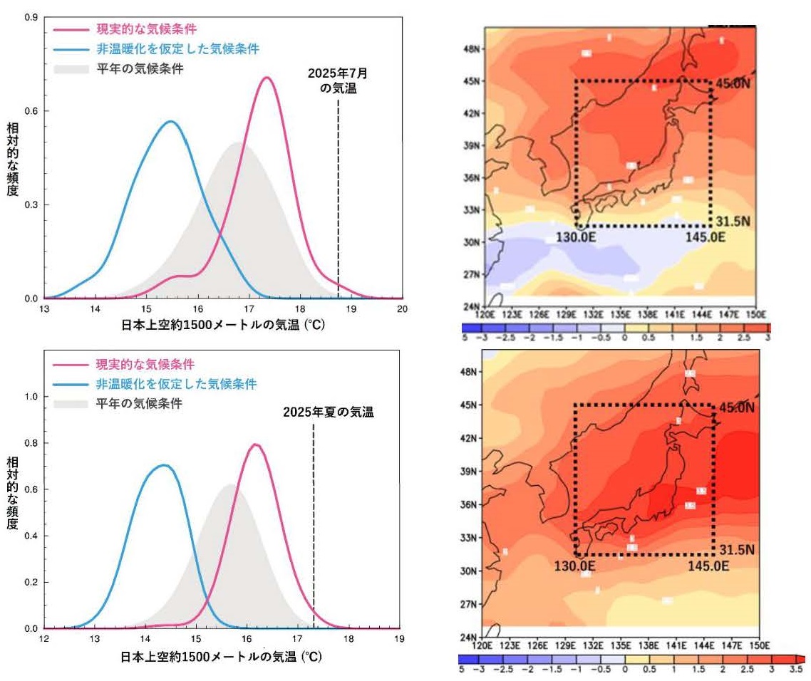 左:赤線は実際の(温暖化がある)2025年の気候条件下、青線は温暖化が無かった場合の2025年の気候条件下での推定された確率分布で、灰色は平年(1991~2020年)期間から推定された確率分布、右:850hPa気温規格化偏差の分布と日本付近の気温をもとめた矩形領域。