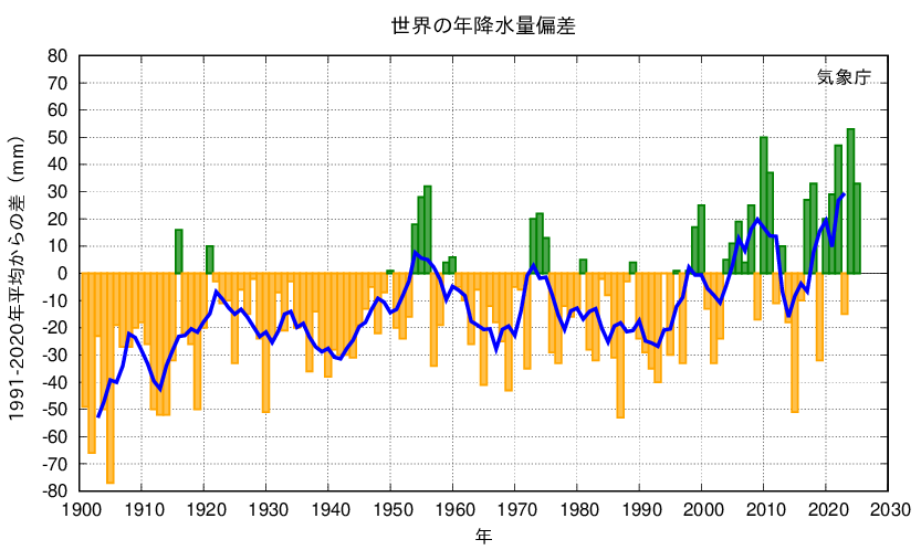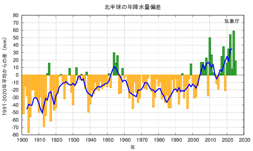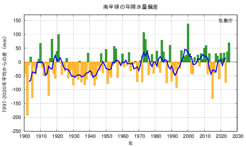 2025年の世界の陸域の降水量の基準値(1991〜2020年の30年平均値)からの偏差は+33mmでした。半球別に見ると、北半球は+19mm、南半球は+69mmでした。世界の陸域の年降水量は1901年の統計開始以降、周期的な変動を繰り返しています。北半球では、1950年代、2000年代半ば以降に降水量の多い時期が現れています。