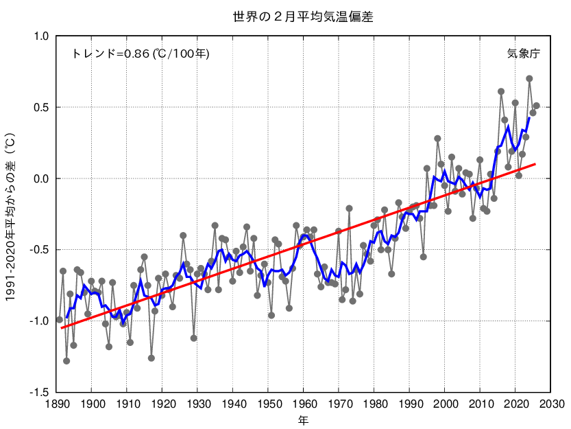 2026年2月の世界の平均気温(陸域における地表付近の気温と海面水温の平均)の基準値(1991〜2020年の30年平均値)からの偏差は+0.51℃で、1891年の統計開始以降、4番目に高い値となりました。世界の2月平均気温は、様々な変動を繰り返しながら上昇しており、長期的には100年あたり0.86℃の割合で上昇しています。