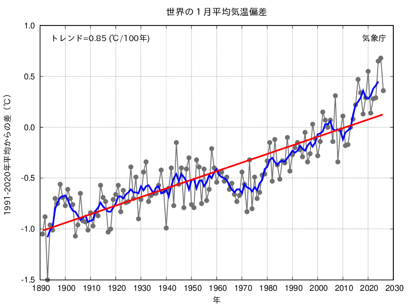世界の1月平均気温偏差の経年変化(1891〜2026年)