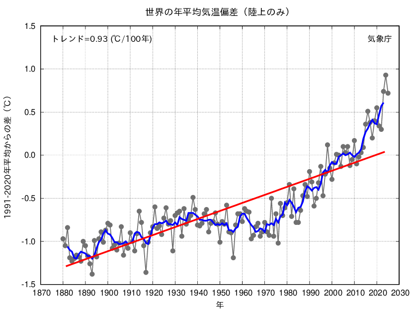 世界の年平均気温偏差(陸上のみ)の経年変化(1880〜2025年)