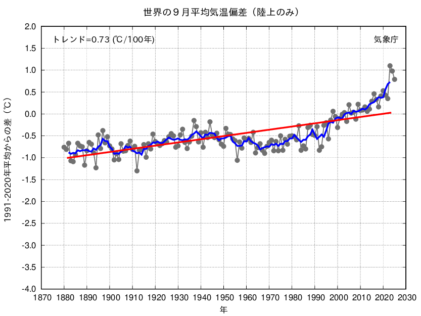 2025年9月の世界の平均気温(陸上のみ:陸域における地表付近の気温のみ)の基準値(1991〜2020年の30年平均値)からの偏差は+0.79℃で、1880年の統計開始以降、3番目に高い値となりました。世界の9月平均気温(陸上のみ)は、様々な変動を繰り返しながら上昇しており、長期的には100年あたり0.73℃の割合で上昇しています。