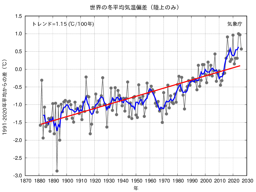 世界の冬(前年12〜2月)平均気温偏差(陸上のみ)の経年変化(1881〜2026年)