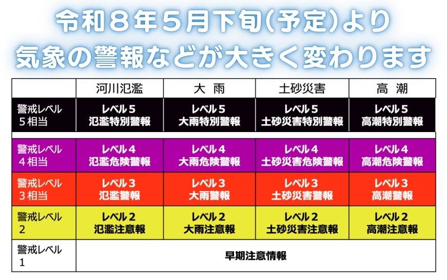 令和8年5月下旬(予定)より気象の警報などが大きく変わります。