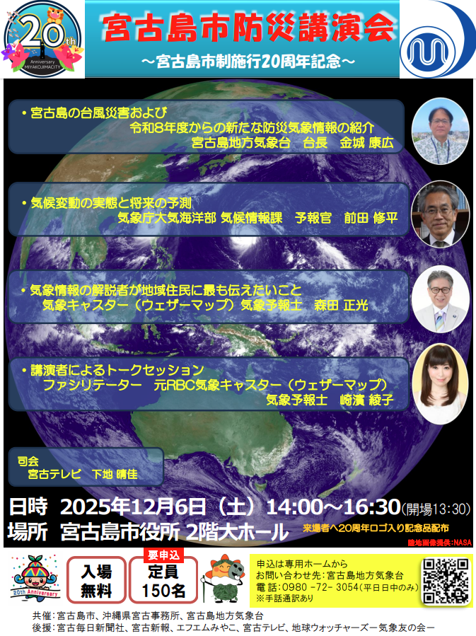 〇講演:宮古島の台風災害および令和8年度からの新たな防災気象情報の紹介 宮古島地方気象台 台長 金城 康広 〇講演:気候変動の実態と将来の予測 気象庁大気海洋部気候情報課 予報官 前田 修平 〇講演:気象情報の解説者が地域住民に最も伝えたいこと 気象キャスター(ウェザーマップ) 気象予報士 森田 正光 〇講演者によるトークセッション: ファシリテーター 元RBC気象キャスター(ウェザーマップ) 気象予報士 崎濱 綾子 |