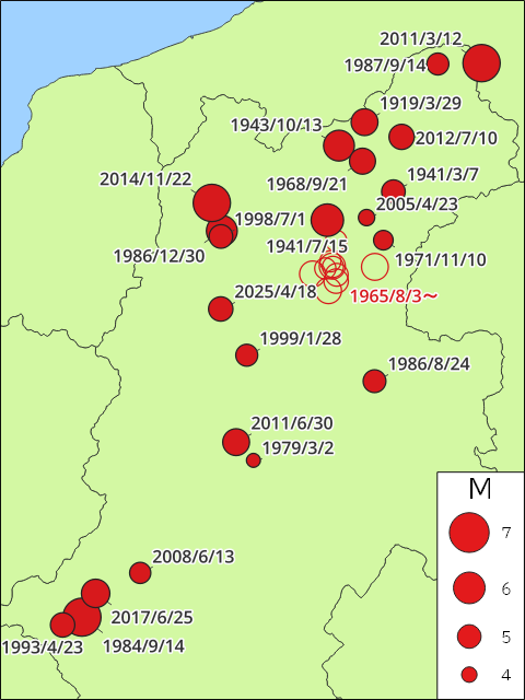 | 令和7(2025)年 4月18日 | 長野県北部 | 5.1 | 5弱 | 住家一部破損5棟など。 |