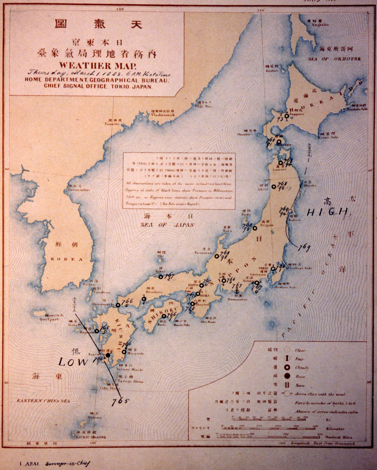 当時の天気図を確認すると、中国東北区に中心を持つ高気圧があり、日本の東には低気圧があって、日本付近は等圧線が縦に並んだ西高東低の気圧配置になっていることが分かります。