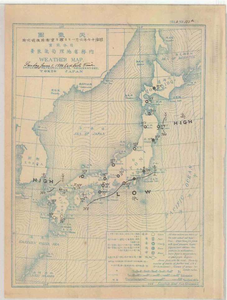 ドイツ人のクニッピング(E. Knipping)によって、明治16(1883)年2月16日に日本初の天気図が作られ、同年3月1日からは毎日の天気図の印刷配布が始まりました。当時は、電報により収集した実況観測値を紙の地図に手描きで記入し、手描きで等圧線等を解析するものでした。現在では天気図解析システムの導入により、数値予報モデルの等圧線を原型とし、実況観測値などに合わせて等圧線に修正を加えつつ高気圧や低気圧、前線を解析するような作業形態に変わりました。その結果手作業の負担が軽減され、その後の「速報天気図」やデジタルデータの提供などにつながりました。詳しくは「気象業務の歴史」のページをご覧ください。