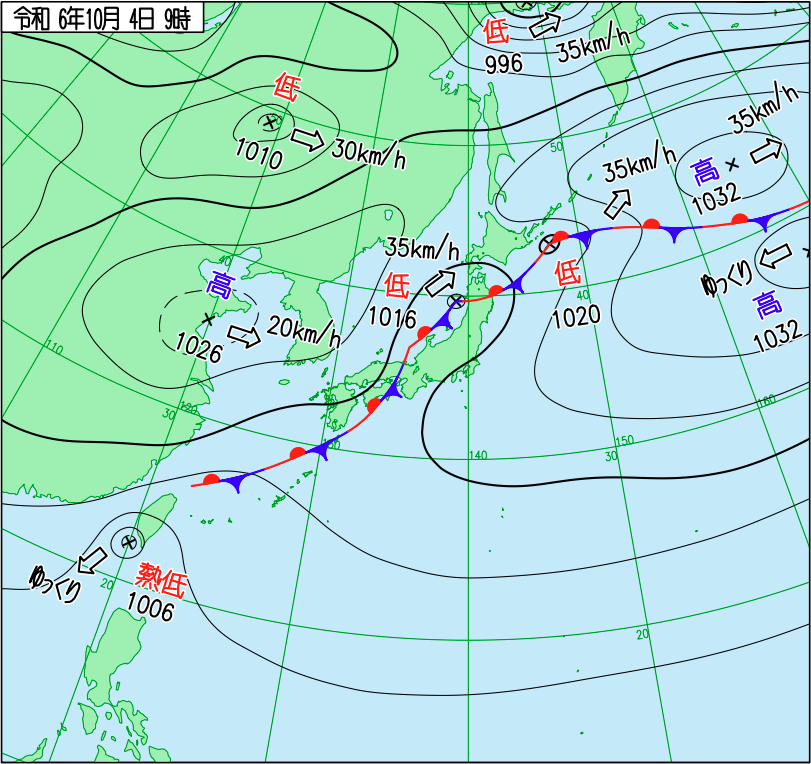 天気図とは、気象現象を把握するために、各地で観測された天気、気圧などの値を、等圧線や様々な記号を用いて地図上に表した図のことです。これにより、大気の状態を視覚的に理解でき、日々の天気予報や気象解析に活用されています。天気図は、気圧配置や前線の位置、低気圧・高気圧の動きなどを示すことで、天気の変化を予測する重要な手がかりとなります。