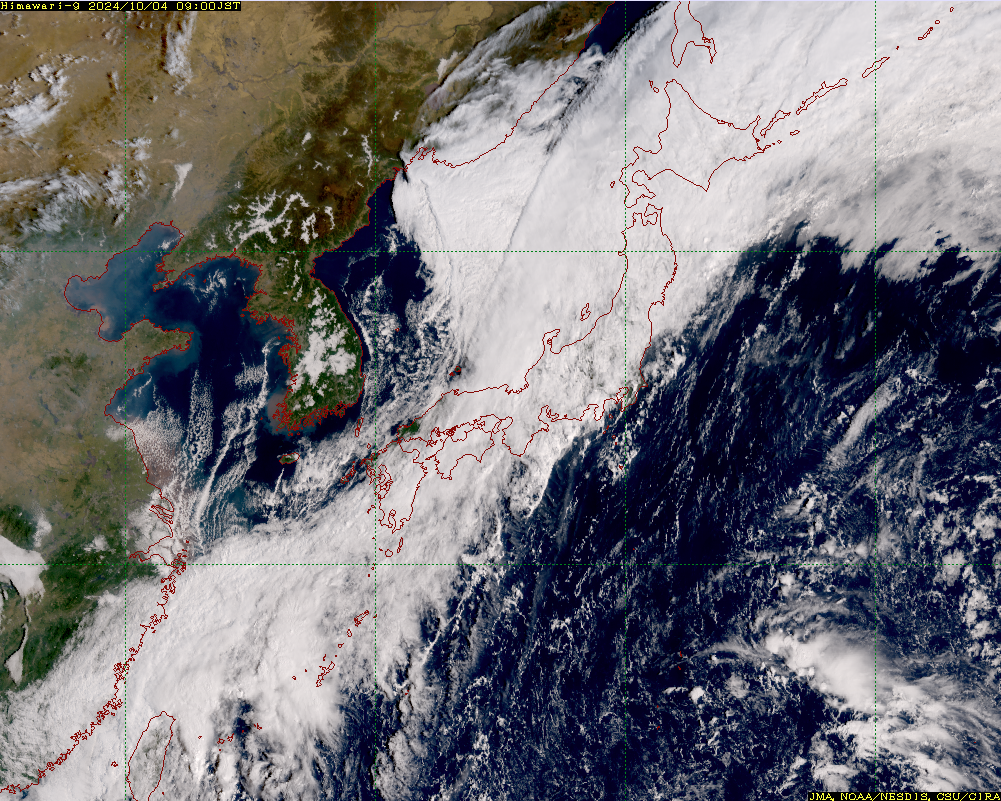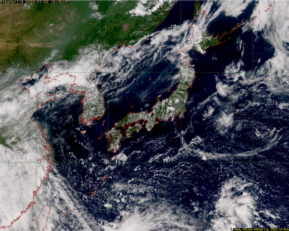 下図の天気図では、日本列島が太平洋高気圧に覆われている様子が示されています。高気圧の中心は太平洋上にあり、日本付近まで張り出しているため、広い範囲で晴天となります。衛星写真では、日本列島周辺に雲が少なく、太平洋高気圧の影響で安定した晴天が広がっていることがわかります。ただし、内陸部や山沿いでは、強い日射による対流活動で積乱雲が発生し、局地的な雷雨となる場合があります。