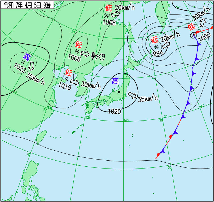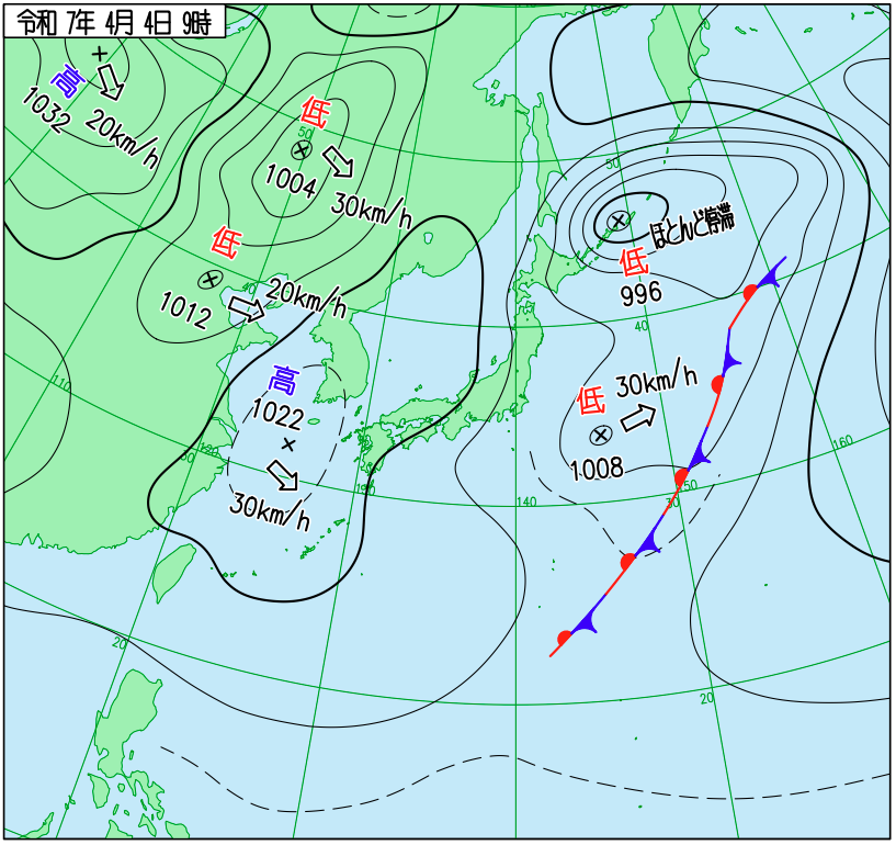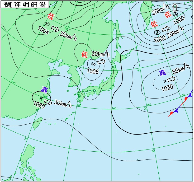 下図は令和7年4月上旬の日本周辺域の実況天気図です。4日9時の天気図では東シナ海に中心を持つ高気圧が見られますが、5日9時にはその高気圧が日本付近を広く覆い、6日9時には日本の東へと移動しています。高気圧の後面には低気圧や次の高気圧が西から近づいており、春特有の数日周期の天気変化が確認できます。