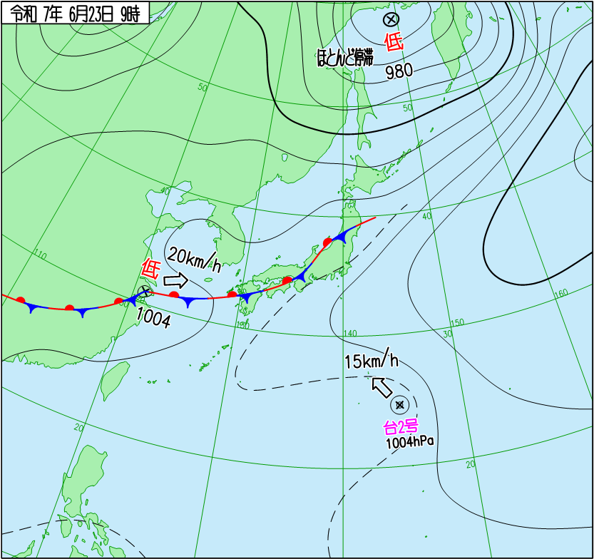 令和7年6月23日9時の天気図を見ると、北日本から華中にかけて梅雨前線が停滞していることがわかり、衛星画像で前線に対応した雲が広がっていることが確認できます。