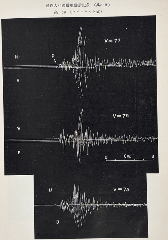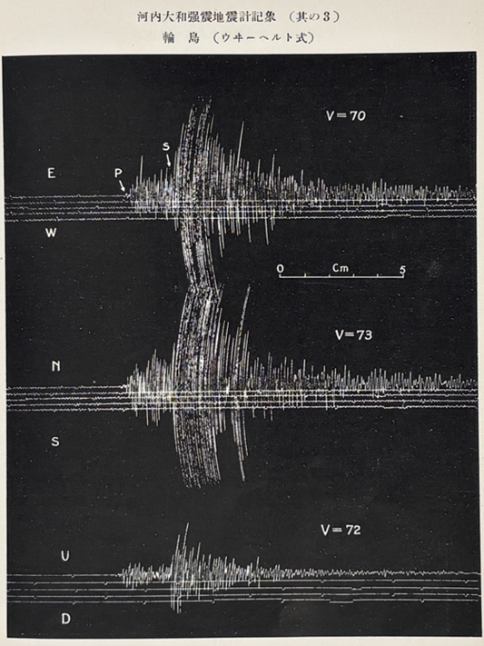 【河内大和強震調査報告の原文】本所内に於ては南面の硝子窓一枚破壊し所々に壁の亀裂を生じ応接室のドアーの板が一枚剥され振子時計は全部停止した、地震計は倍率卅倍の大森式簡単微動計であるが本地震の如く震源が近い上に強震のため東西動の描針は一たまりもなく記録紙外に飛び出し其の上地震計が台石に固定してないので移動するなど是等を手早く直すのに苦労した、斯様の状態であるから遂に最大振幅を測ることができなかったのは遺憾千万である、若し強震計が有ったら充分の観測が出来たものをと思い今更ながら強震計の必要を痛切に感じた。【ここまで】