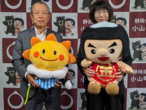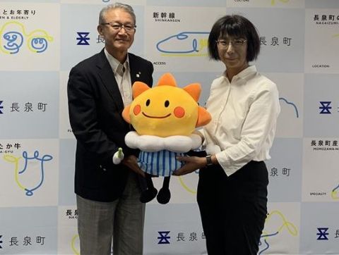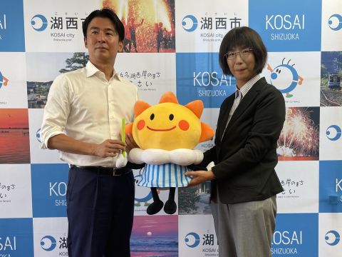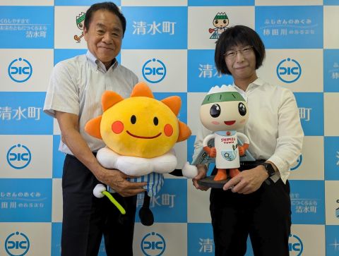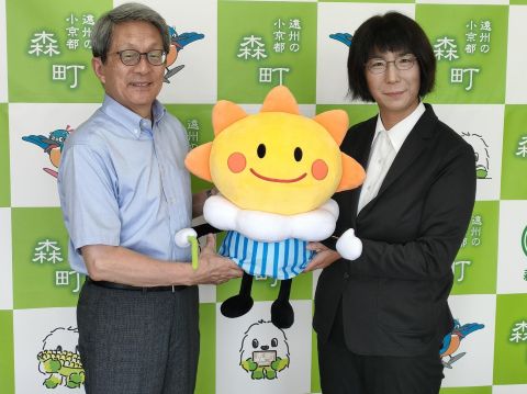 写真で、首長と台長で一緒に写っているぬいぐるみは気象庁マスコットキャラクター「はれるん」です。